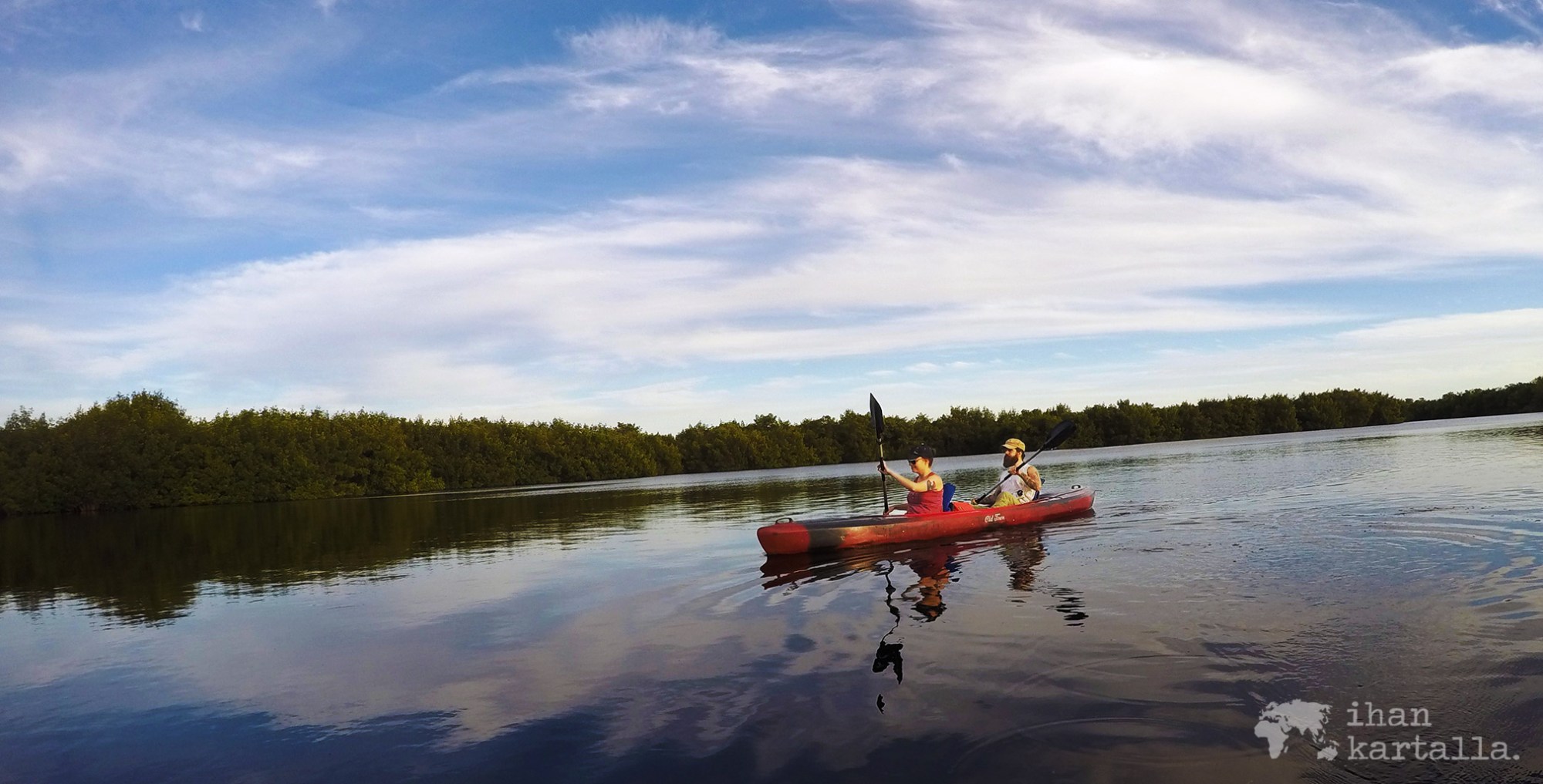Oppaamme Tod saapuu paikalle pian jälkeemme pick-upillaan ja kehottaa meitä ajamaan perässään muutaman mailin matkan kajakkiretkemme lähtöpaikalle.Retkellä ei ole meidän lisäksemme muita osallistujia, joten tiedossa ei ole myöskään tavalliselle turistikierrokselle tyypillistä hälinää.Valitsemme kahden hengen tandemkajakin ja Jenni asettuu aluksemme etuosaan. Jonkin matkan päässä rannasta hyppää ilmaan kelttikala, jotka ovat kuulemma alueelle tyypillisiä. Eivät kuitenkaan niin tyypillisiä kuin alligaattorit, joita meidänkin pitäisi retkellämme nähdä. Jo ensihetkistä on selvää, että Tod rakastaa työtään ja tietää todella paljon alueen luonnosta sekä kasveista ja eläimistä.