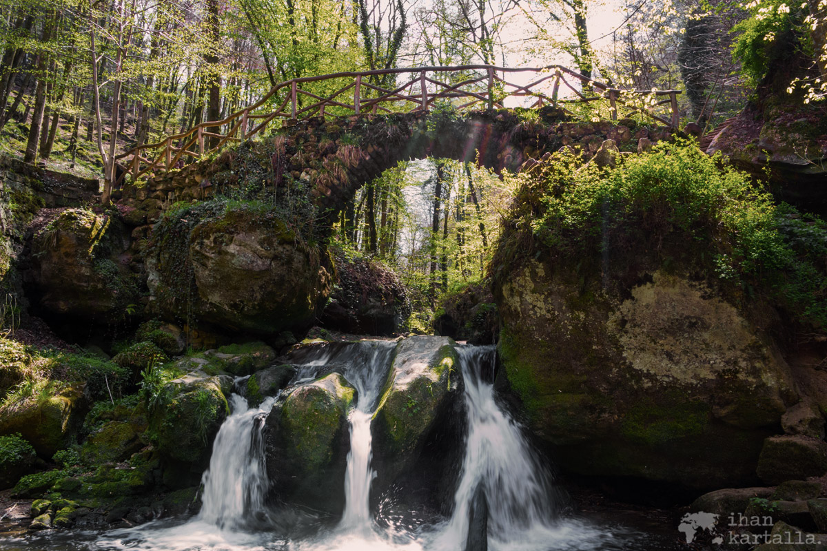 Schiessentümpel-vesiputoukselle pääseminen ei tosiaan juuri ponnistuksia vaadi, sillä noin 500 metrin päässä siitä sijaitsee parkkipaikka ja perille voi kävellä myös pitkin päällystettyä jalkakäytävää. Ympäröivissä metsissä risteilee polkuja, puro solisee ja sen toisella puolen kohoaa yllättäen pystysuora kallioseinämä, jota on hankala erottaa tiheän puuston läpi.