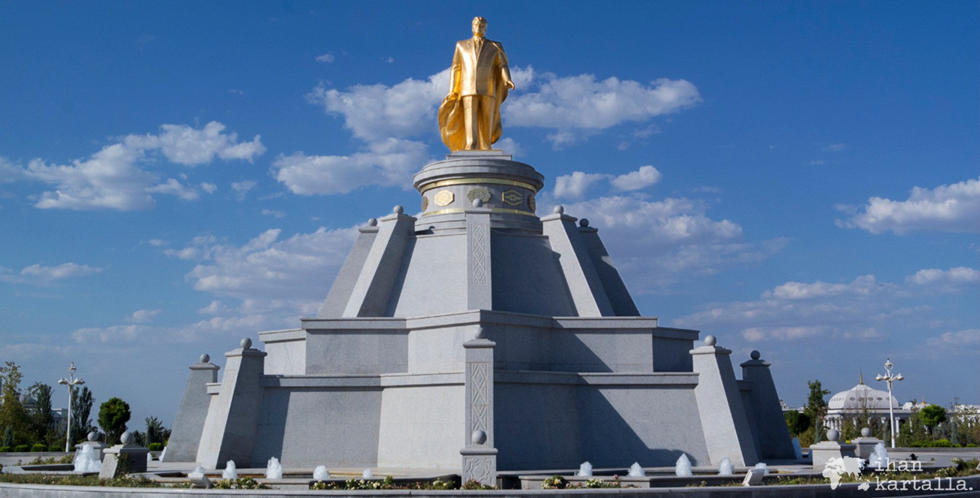 Ohitan lisää prameita rakennuksia, jotka kiiltelevät valkoista marmoria, kultaa ja lasia. Jalankulkijoita ei näy oikeastaan missään ja autojakin vilahtelee ohi vain silloin tällöin. Eräässä kadunkulmassa on tulkintani mukaan mattoministeriö ja esiintyvätpä matot myös Turkmenistanin lipussa. Erään puiston monumenttiin on nykyinen presidenttikin päässyt kansaa tervehtimään, mutta hän vastapäätä tuijottaa kultaisena korokkeelta kukapa muukaan kuin vanha kunnon Türkmenbaşy.