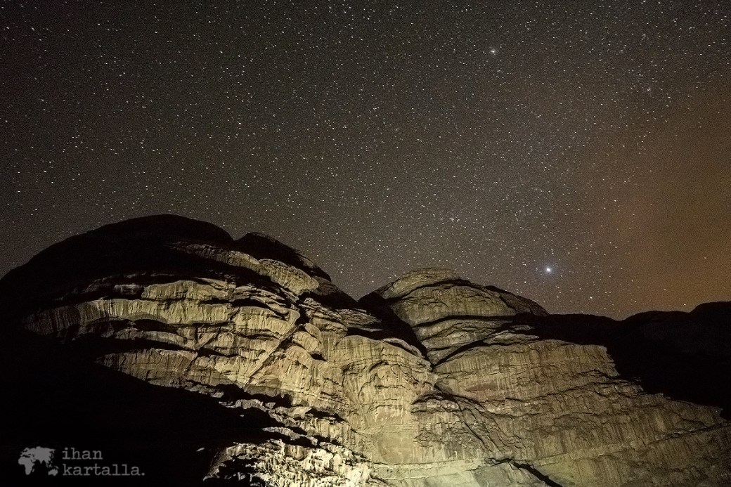 Ruoan jälkeen beduiinit pistävät oleskeluteltassa pystyyn pienet tanssit laulun ja soiton merkeissä. Minä sen sijaan hiivin telttojen takana avautuvan pimeyden keskelle koettaakseni valokuvata aavikon tähtitaivasta. Viritän jalustan hiekalle ja kokeilen summamutikassa muutamia asetuksia todeten, että ehkä tälläisella peruskameralla saa korkeintaan tyydyttävää jälkeä. Vika saattaa tosin hyvinkin olla myös käyttäjässä.