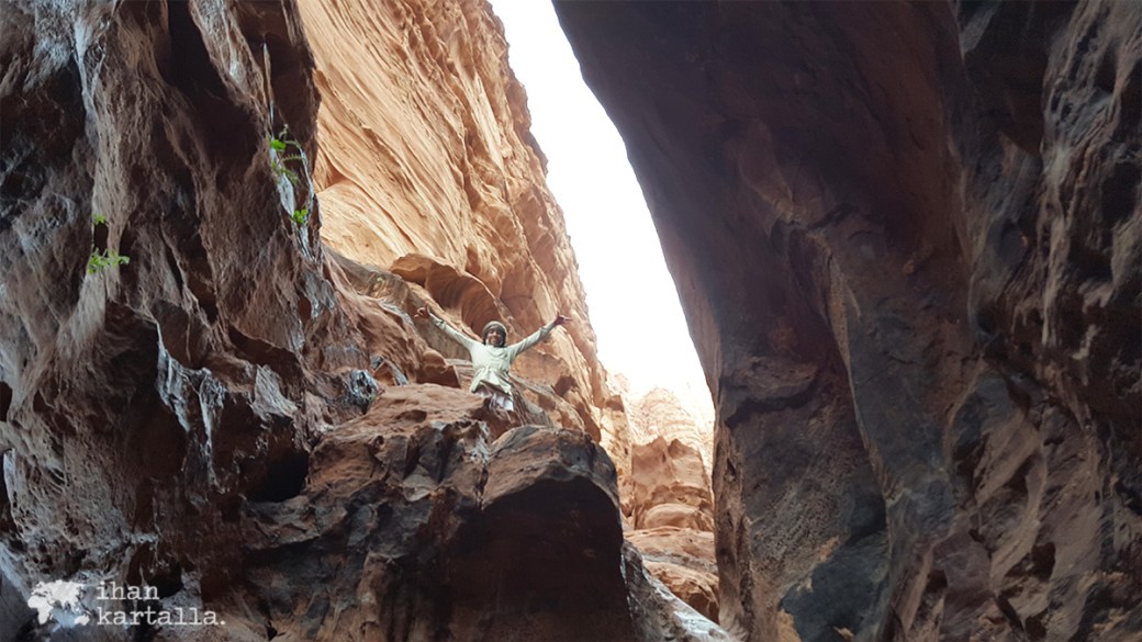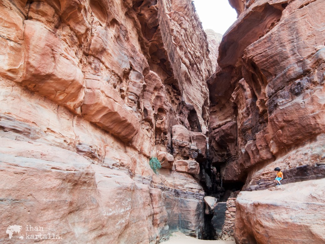 Sitten edessä onkin noin 10 metrin korkuinen lähes pystysuora seinämä, jonka nuori beduuini loikkii ylös tottuneen ketterästi. Lonely Planetista muistan lukeneeni, että pidemmälle railoon eteneminen vaatii köysiä ja varusteita, enkä edes ajattele ryhtyväni toistamaan perässä äsken todistamaani suoritusta. Alastulo meinaakin sitten tuottaa hieman hankaluuksia myös paikalliselle sankarille, mutta onneksi tuo tuolta yhtenä kappaleena selviää.