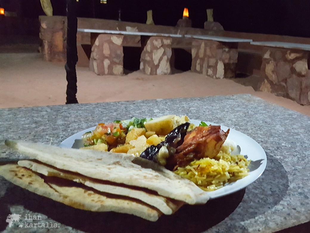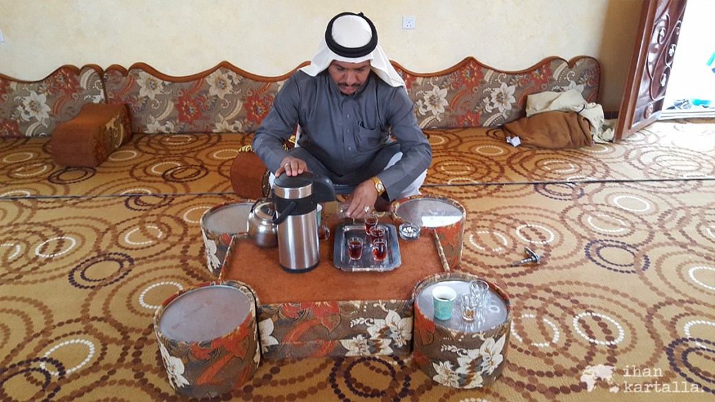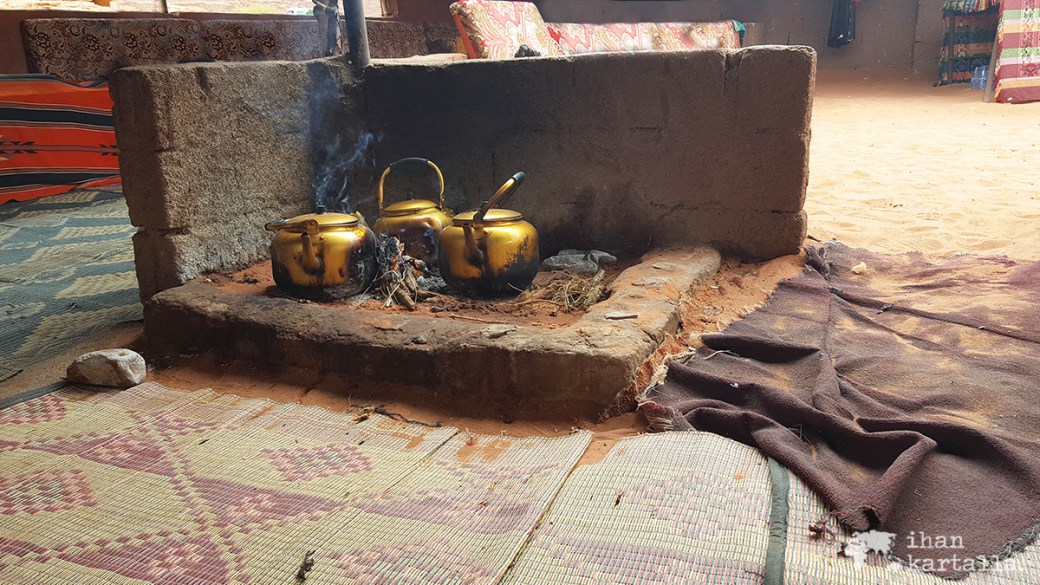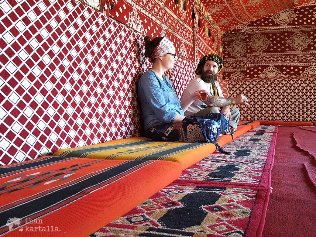 Tervetuliaistee tarjoillaan matoilla ja tyynyillä sisustetussa perinteisessä beduiiniteltassa, jossa meidät ottaa vastaan yksi omistajaveljeksistä. Samaan aikaan paikalle saapuu myös muutamia muita matkalaisia, joskin autokyydillä ja vaihdamme pikaisesti kuulumisia ennen kuin käymme tutustumassa telttaamme.
