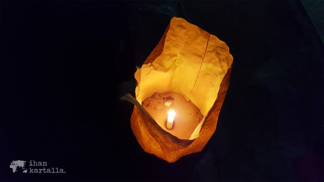 Auringon laskettua on illallisen aika. Paperilyhdyillä valaistu kuja johtaa ruokailutilana toimivalle telttakatokselle ja jälleen maakuopasta kaivetaan paikalliseen rosvopaistiin kuuluva kokonaisuus kanaa, riisiä ja kasviksia.
