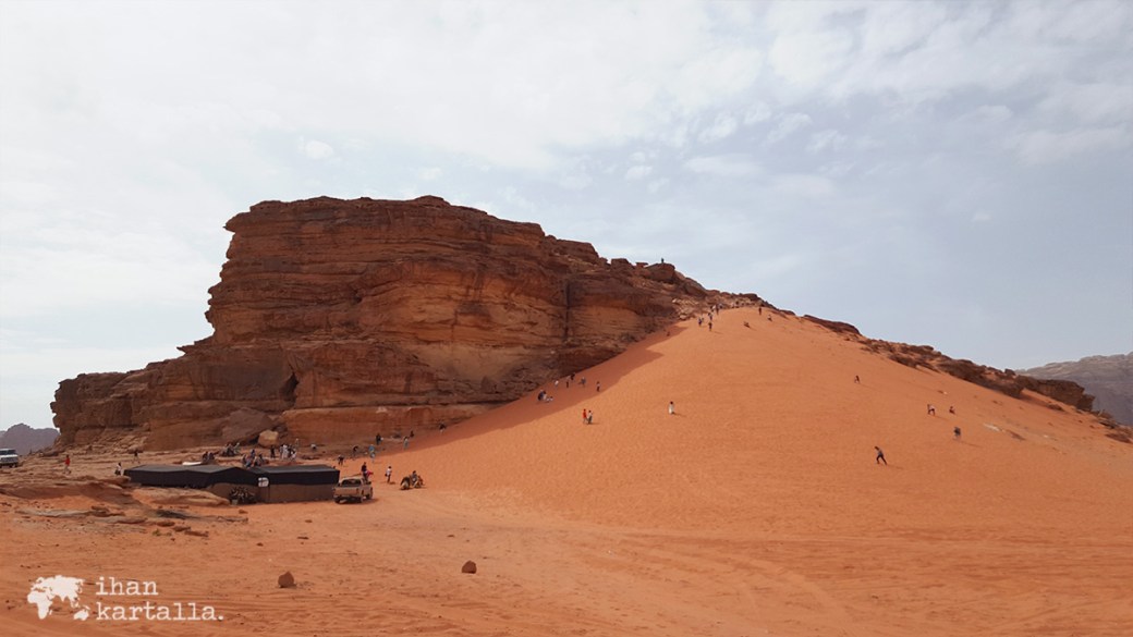 Kameliratsastusten lisäksi Wadi Rumin aavikolla järjestetään kierroksia myös lava-autoilla ja dyynin juurella onkin useampi Toyota parkissa. Osa kyytiläisistä näkyy kapuamassa pitkin dyynin rinnettä ja toiset laskevat alas lumilaudoilla. Toki minunkin on duunin huipulla käytävä näkymät katsastamassa.