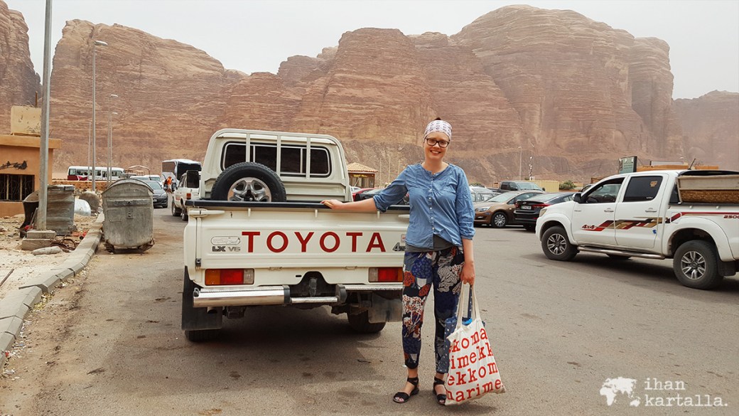 Kallioiden suojasta takaisin aavikon armoille päästyämme alkaa tuulen ja silloin tällöin ympärillä vilahtelevien lava-autojen mukana pöllytä sen verran hiekkaa, että on parasta kietoa huivia hieman myös kasvojen suojaksi.