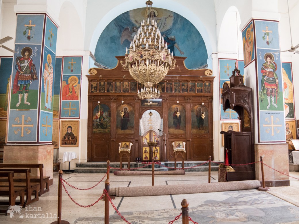 Lopuksi käymme vielä vilkaisemassa Pyhän Yrjön kirkon lattiasta löytyvät Madaban tunnetuimmat mosaiikit. Kohde onkin ainoa, jonne Jordan Pass ei ilmaista sisäänpääsyä tarjoa, joten maksamme mukisematta nimelliset yhden dinaarin pääsyliput.