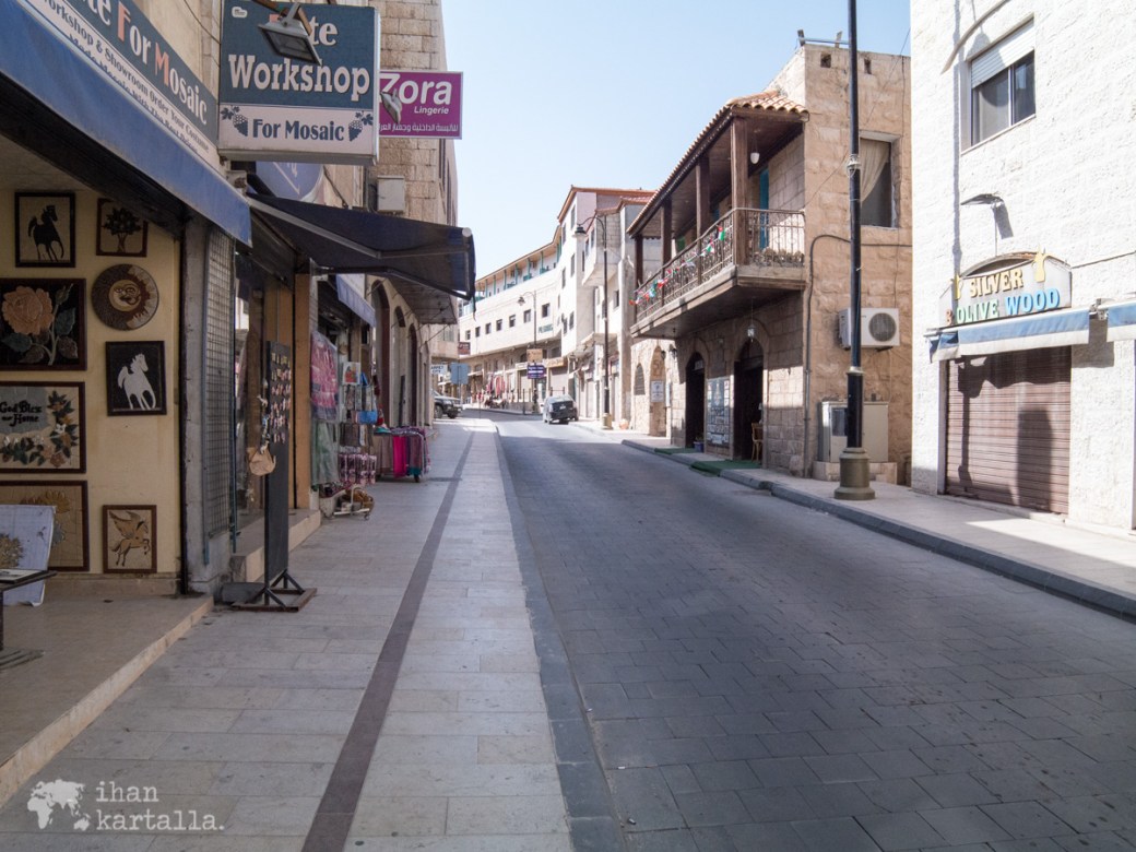 Lentokentän kohdalta käännymme pienelle maantielle ja kohta vehreiden peltojen keskeltä paljastuu Madaban ”mosaiikkikaupunki”, jonka ruuhkaisilla kaduilla oikeaan paikkaan navigointi on hieman haastavaa. Lopulta löydämme tiemme Visitors Centerin liepeille ja jätämme auton kadun varrelle parkkiin.