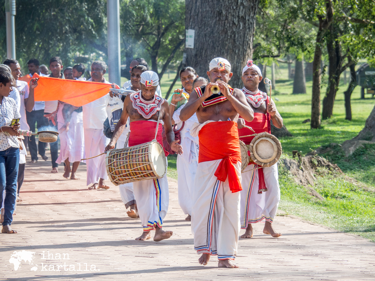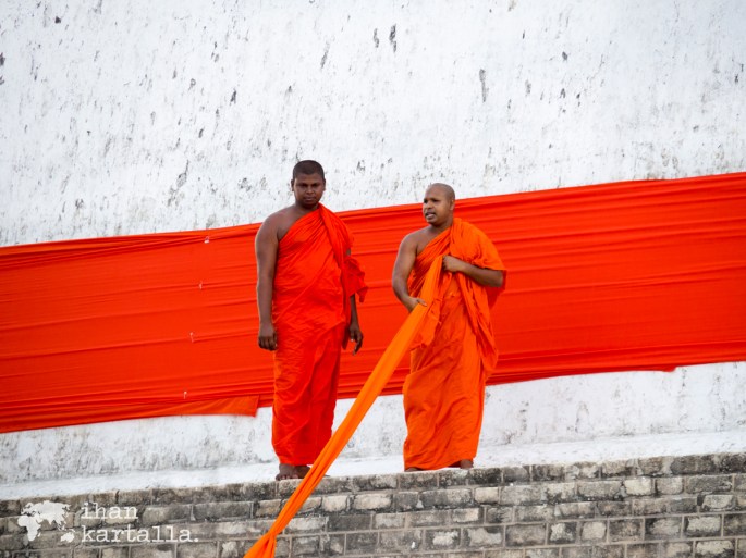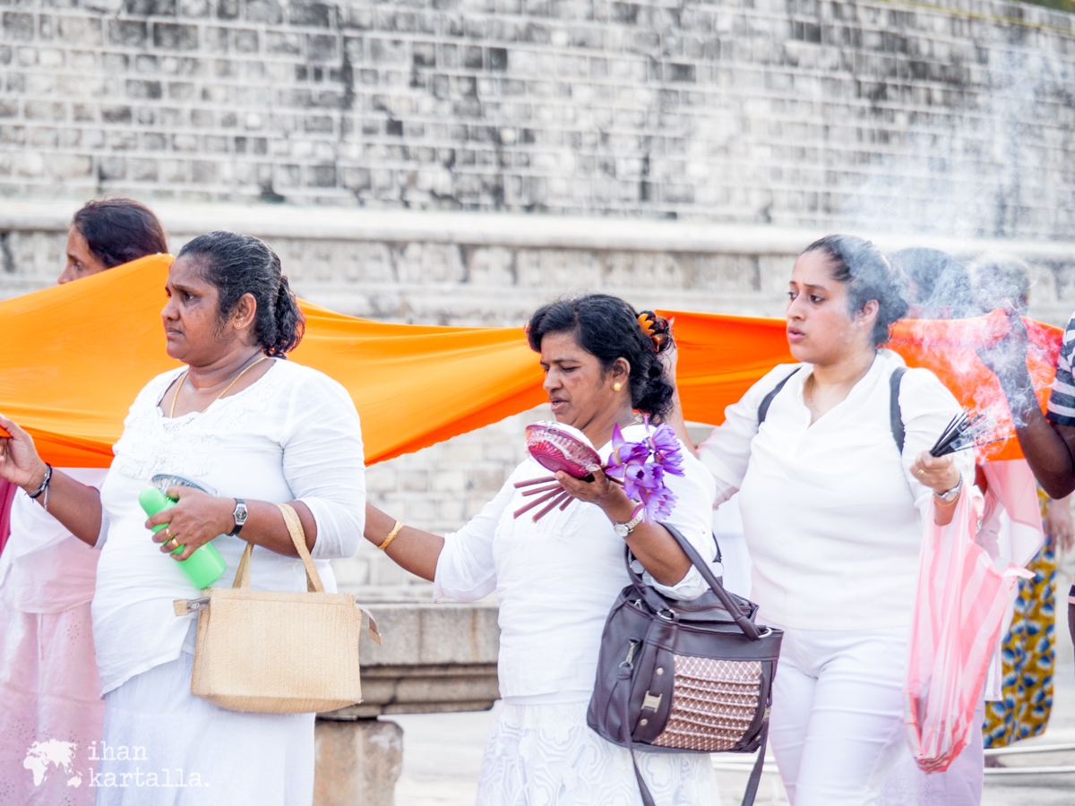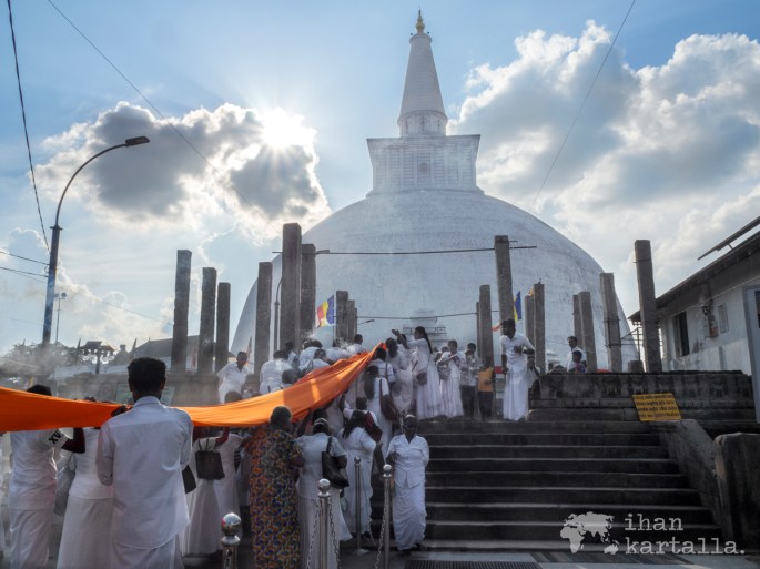 Onneksemme matkamme osuu Sri Lankan buddhalaisille tärkeän Poya-päivän eli täydenkuunpäivän tienoille ja niinpä saamme sattumalta ihastella vaikuttavaa seremoniaa, jossa Ruwanwelisaya stupa saa ympärilleen oranssin nauhan. Torvet ja rummut soivat sekä suitsukkeet palavat, kun kulkue kannattelee yli 200 metrisen kankaan paikalle ja lopulta se kiedotaan jättimäisen rakennuksen ympärille kuin mikäkin rusetti.