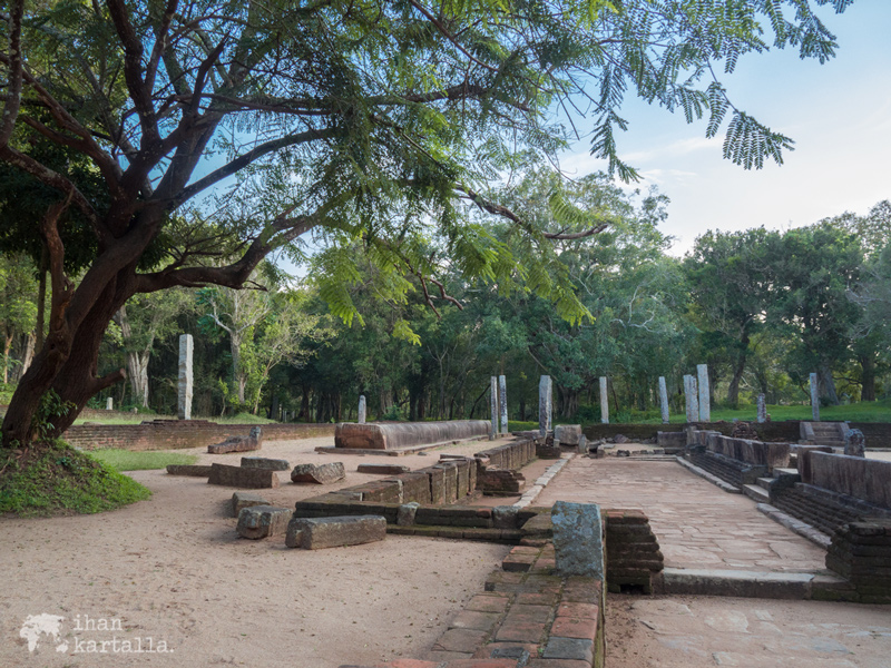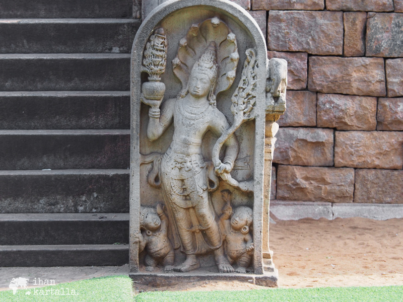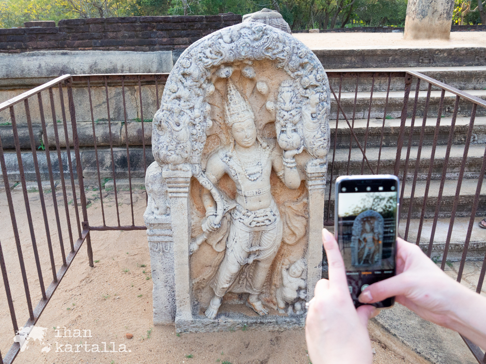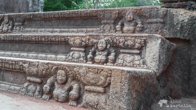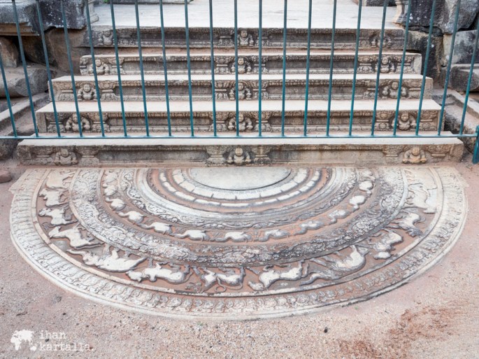 Viimeiseksi käymme katsastamassa kaksi sinhalilaisen arkkitehtuurin erikoispiirrettä ja hyvin säilynyttä helmeä eli ”vartijakiveä” ja ”kuukiveä”. Vartijakivi eli muragala on palvontapaikkaan johtavien portaiden juurella sijaitseva kivinen veistos, joka nimestään huolimatta on nykytiedon valossa ollut pikemminkin koriste kuin pahoilta hengiltä tai muilta viheliäisiltä otuksilta suojeleva vartija.