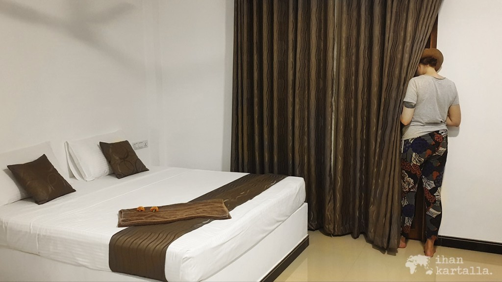 Majapaikassa yksi kotoa asti rakkaudella raahattu alkoholiton olut, suihku ja netin vilkaisu ikkunan äärellä verhojen takana, joka tuntuu olevan ainoa piste koko huoneessa, jossa WiFi suostuu joten kuten toimimaan. Sitten onkin syytä hankkiutua nukkumaan, sillä herätys on jo viideltä, seitsemältä kun pitää olla jo kiipeämässä kohti Sigiryan eli Lion Rockin huippua. Jenni on tosin ilmoittanut suosiolla jättävänsä tuon lystin väliin ja jäävänsä hotellille lepäilemään, hän kun ei liiemmin arvosta korkeita paikkoja.