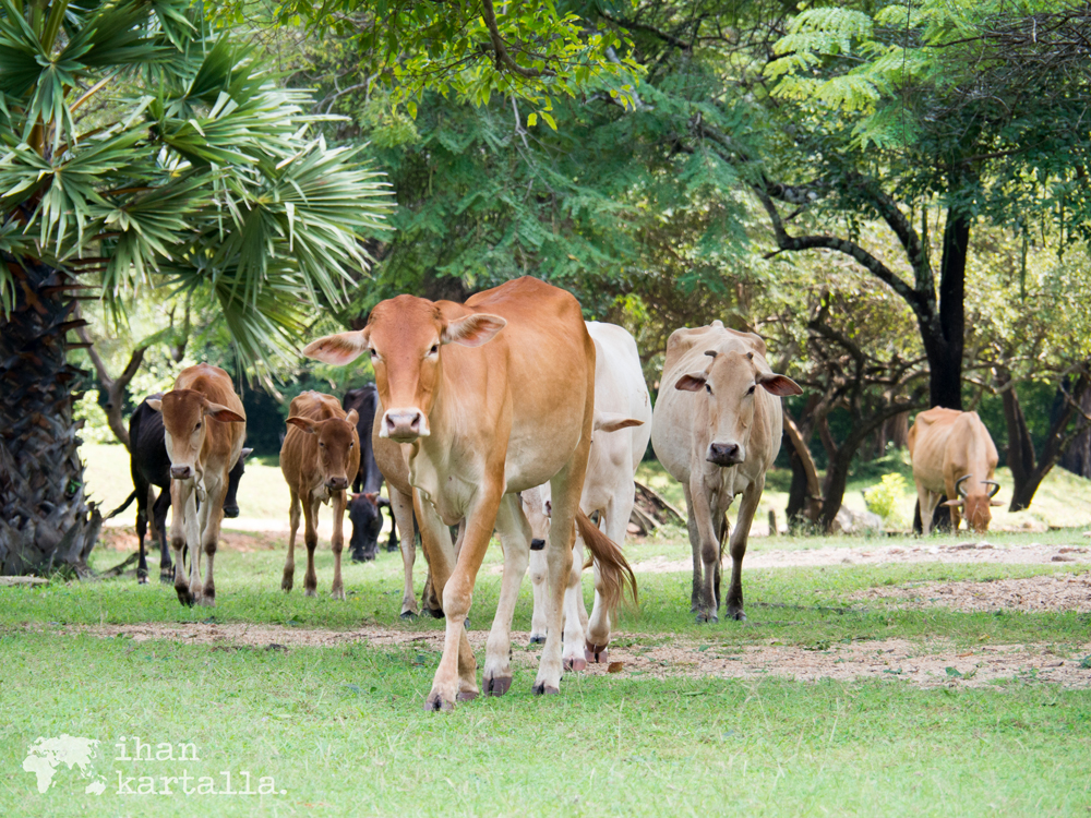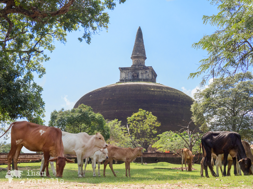 Autolle kävelessämme pysähdymme vielä toviksi Rankot Vihara stupan edustalle, jonka vehreys näyttää houkuttelevan ruohikossa vilistävien liskojen lisäksi paikalle myös suurikokoisempia vieraita. Palmujen lomasta nimittäin löntystelee yhtäkkiä paikalle lauma lehmiä ja tilanteessa on jotain kovin kotoista ja samalla surrealistisen hämmentävää.