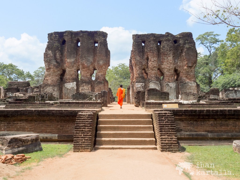 Perillä Polonnaruwassa vierailemme ensin jonkinlaisessa vierailijakeskuksessa, josta saamme ostettua noin 20 euroa maksavat liput muinaiseen rauniokaupunkiin, joka käytännössä levittäytyy melko laajalle alueelle. Kuljettajamme onneksi tietää mistä löytyy mitäkin ja päätämme käydä katsastamassa ne tärkeimmät, kuten kuningas Parakramabahun palatsin, jonka sisäänkäyntiä kohden astelee juuri paikalle saapuessamme oranssiin kaapuun pukeutunut munkki ja minulle tulee kiire kaivaa kamera esiin laukustani.