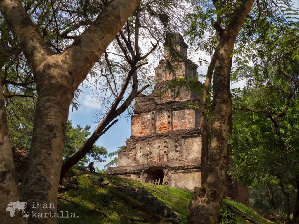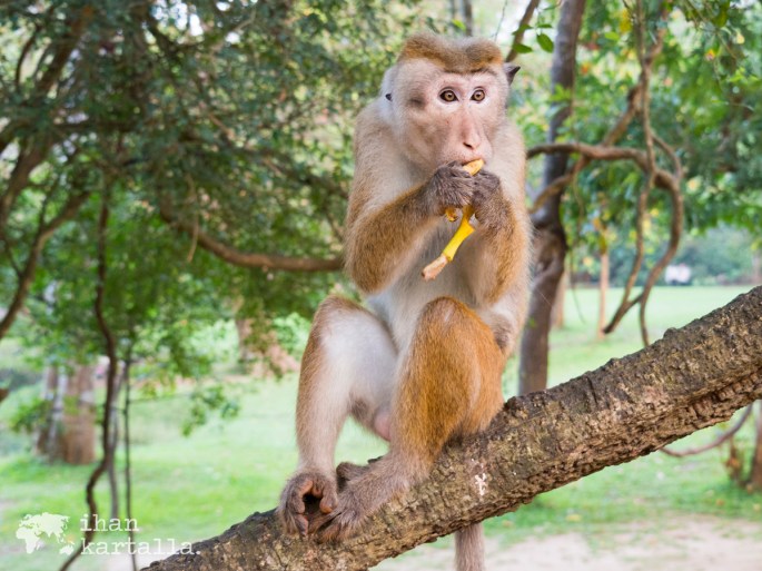 Paikalla on yllättävän rauhallista, meidän ja muutaman muun turistin lisäksi raunioita kiertelee paikallisten koululaisten ryhmä. Vilkkaita apinoita sen sijaan vilahtelee siellä täällä ja tajuan, että enpä ole tainnut aiemmin vieraillakaan paikassa, jossa olisi yhtä paljon apinoita luontaisessa elinympäristössään.