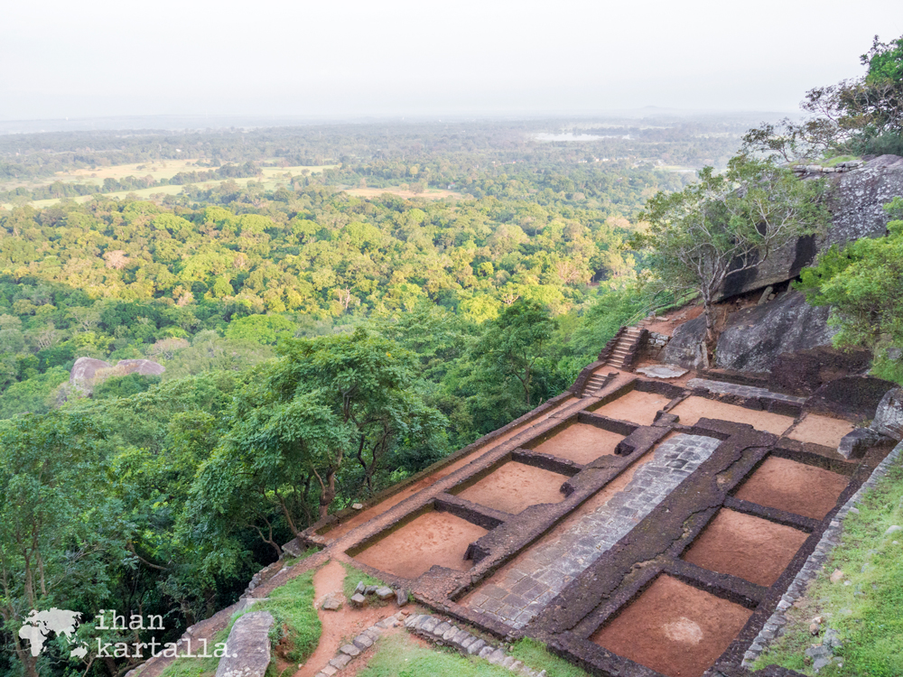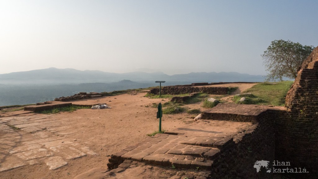 Melko nopeasti huomioni kiinnittyy kuitenkin siihen hämmästyttävään tosiseikkaan, että tuolla huipulla on joskus ammoisina aikoina ollut linnoitus, jonka raunioita on yhä näkyvillä. Eivätkä Sigiryan laelta aukeavat maisematkaan ole lainkaan hullummat. Hämmästykseni kasvaa entisestään, kun valtavan kallion huipulla loikoilee myös lauma koiria. Vettä tai varjoa kun ei liiemmin ole näköpiirissä, saati ruokaa.