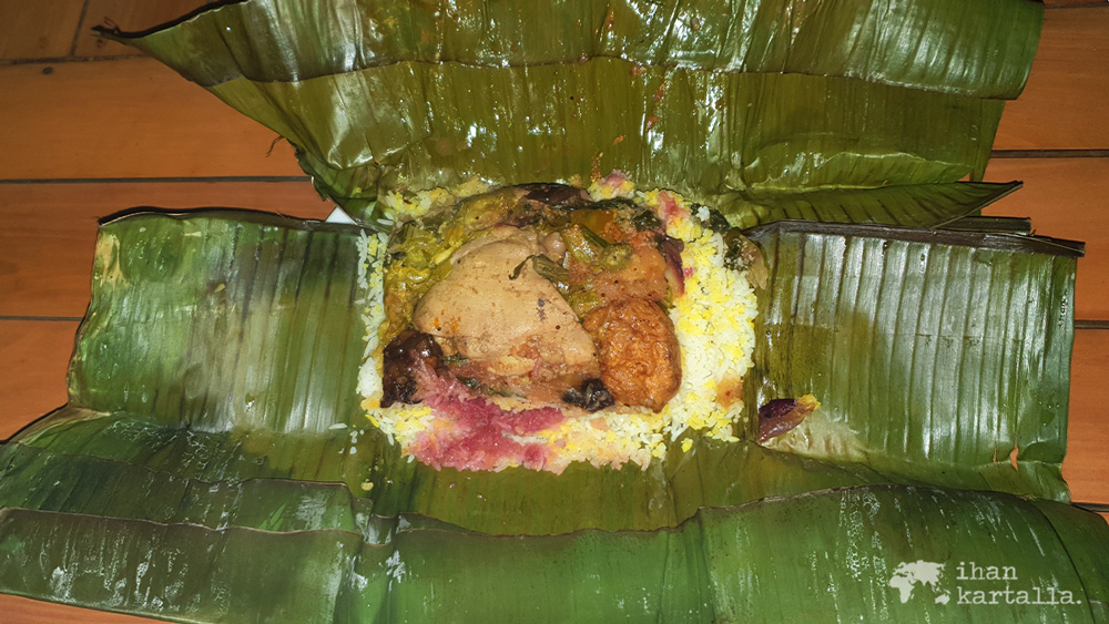 Valitsemme Jennin kanssa lajitelman bambunlehtiin käärittyjä paikallisia curryja eli erilaisia kastikkeita riisin kera nautittavaksi. Kieltämättä hieman rujosta ulkomuodostaan huolimatta annos osoittautuu varsin toimivaksi kokoelmaksi paikallisia makuja.