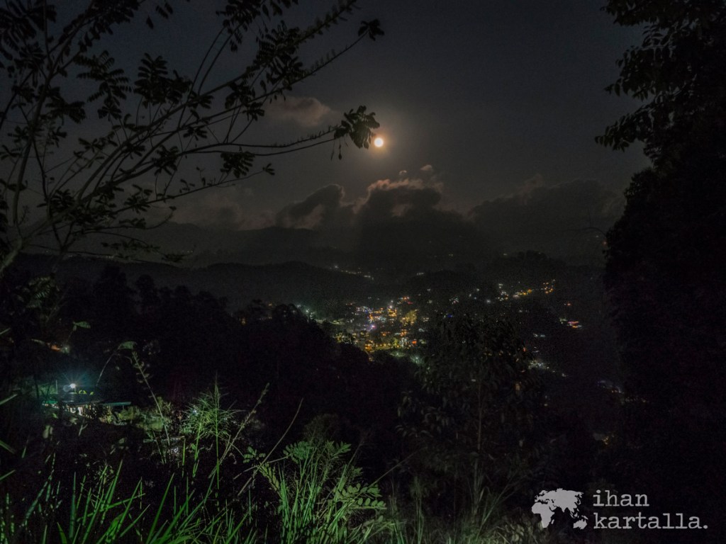 Kello tulee kymmenen ja täysikuu loistaa Ellan vuoristokylän yllä, kun palaamme hotellille. Huoneessamme majaileva gekko on siirtynyt kylpyhuoneesta ”salongin” puolelle ja päivystää nyt katon rajassa. Hyönteisiähän tuo taitaa syödä, joten olkoot tervetullut.