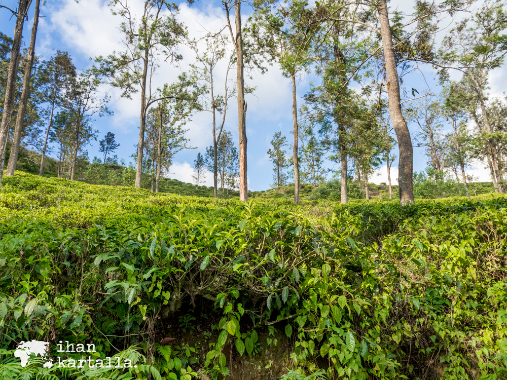 Pieni tie mutkittelee teeplantaasien välissä ja meidät ympäröi yltäkylläinen vehreys. Tien varrella teelehtiä keräämässä oleva nainen suostuu poseeraamaan kuvassa ja pyytää sitten elehtien pientä palkkiota, jonka hänelle mielihyvin ojennan.