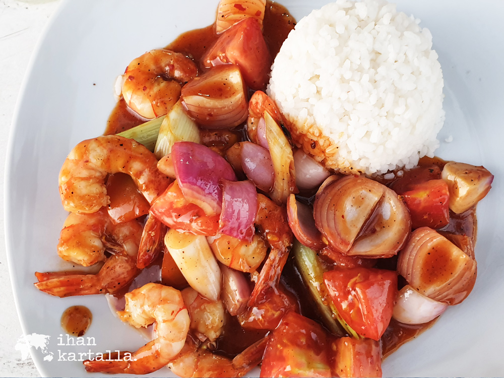 Secret Beach Barista saa paitsi juotavaa, myös syötävää ja päätämme illastaa idyllisellä paikalla. Valitsen listalta Devilled Prawns, joka osoittautuu erinomaiseksi paikalliseksi ateriaksi. Jennin tonnikalapihvi sen sijaan jättää hieman toivomisen varaa.