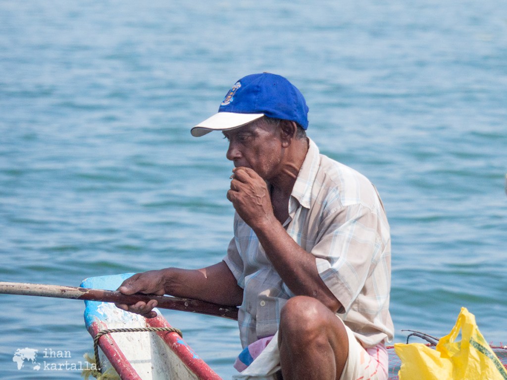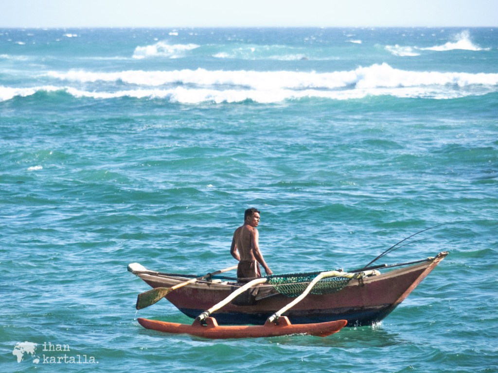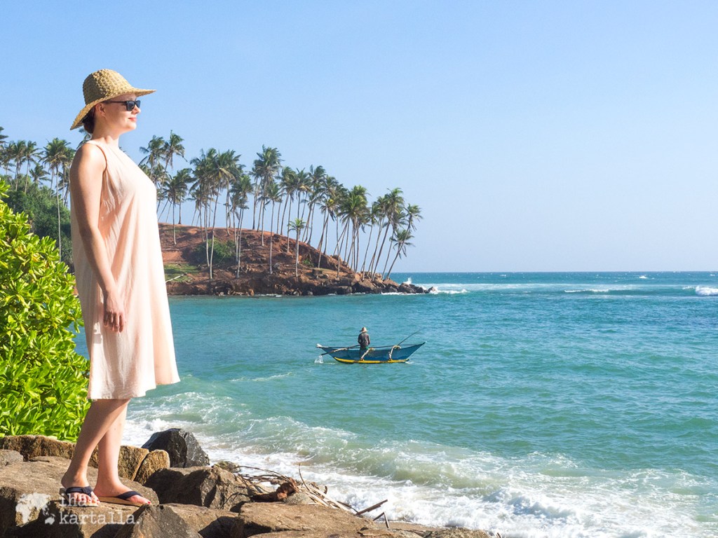 Turkooseilla aalloilla keikkuu yksinäisiä kalastajia värikkäissä veneissään laskeutuessamme kukkulalta Mirissa Beachille. Uimahousut on varta vasten pakattu mukaan, joten onhan sitä nyt meressäkin käytävä pulahtamassa.