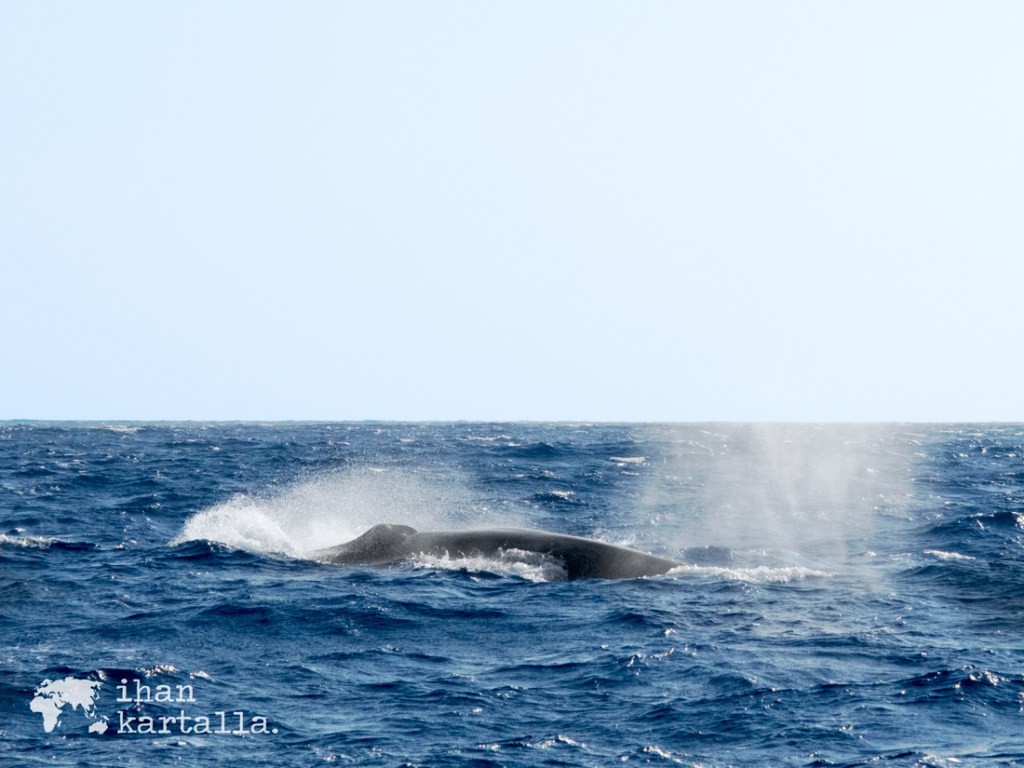 Muita valaita ei lähimailla sitten näykään, mutta tuo yksi puhaltelee vesisuihkuja aina tasaisin väliajoin veneemme pysytellessä riittävän kaukana. Noin neljän tunnin meriseikkailu päättyy puoli yhdeltätoista ja valitettavasti delfiinejä ei paluumatkalla yrityksistä huolimatta näy.